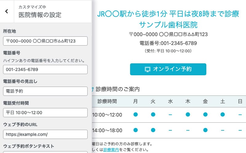 このテーマなら、クリニック情報(所在地/電話番号/受付時間/ウェブ予約URLなど)を一括管理できます。登録した内容は、サイトのヘッダー・フッター・トップページに自動で反映。