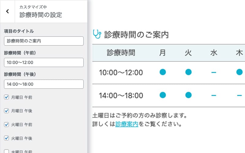 カスタマイザーで診療時間を入力し、曜日ごとの診療帯を選ぶだけ。誰でも見やすく分かりやすい診療時間表が自動で表示されます。