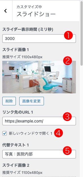 | ❶ スライダー表示時間 | スライド画像の表示時間を変更したい場合に数値を変更します。 初期設定は3000(3秒)です。 |